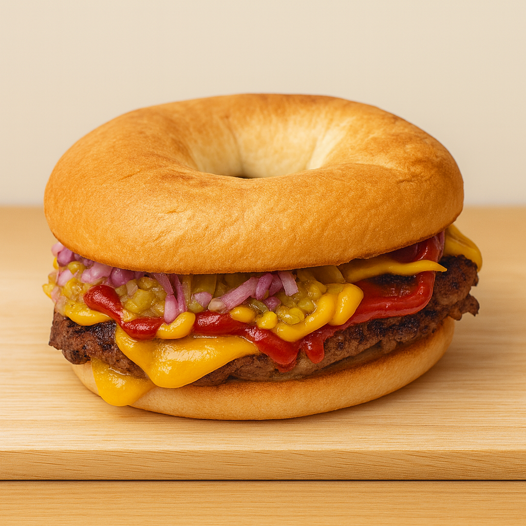 Pastrami jugoso, cheddar fundido, cebolla frita y nuestra mayo mostaza con pepinillo agridulce picado. Elige tu pan de bagel y disfruta de una explosión de sabor a cualquier hora.